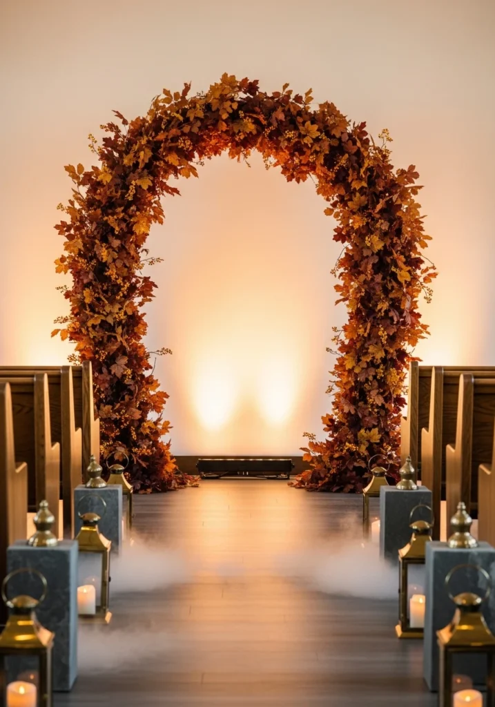 This tall semi-circular arch wrapped in layered maple and beech leaves in rust, amber, and deep crimson creates a natural focal point that needs almost nothing else. Sparse sprayed-gold berries add just enough sparkle without going full glitter.