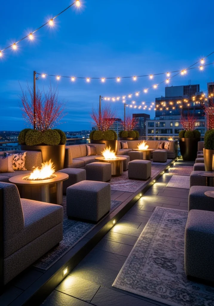 Warm festoon lights overhead and recessed deck uplights create layers of light, and slate flooring with soft wool rugs underfoot makes the whole terrace feel finished. The blue-hour shot shows those warm fires glowing against the cool evening sky.