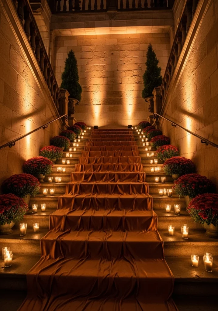 A grand stone staircase gets draped with a single wide silk runner in deep cinnamon, with each step edge lined with low pewter votives and clusters of dark chrysanthemums. Vertical uplights bathe the stone in amber, while tall sculptural evergreen pots at landings add height and drama.