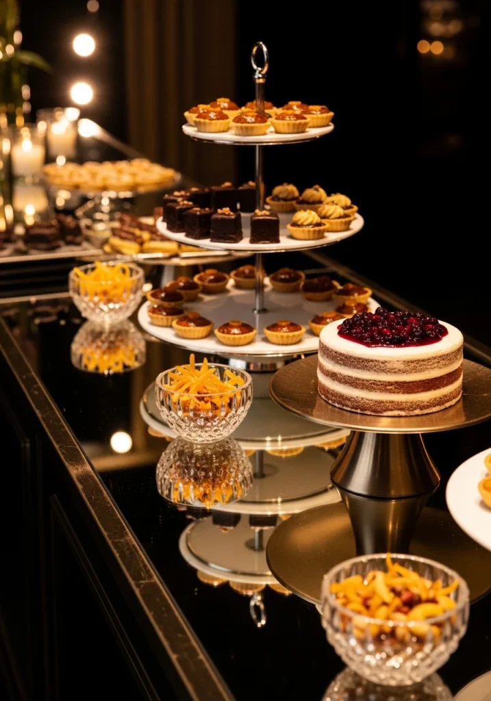 This polished black mirror-top counter creates a glamorous base for tiered pastry stands holding cider-glazed tarts and dark-chocolate petits. Crystal bowls of candied citrus and spiced nuts provide edible garnishes, while a brushed-brass cake stand displays a semi-naked cake topped with deep-berry compote.