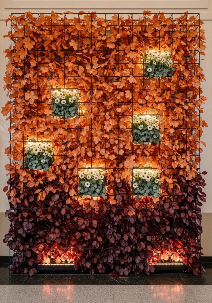 A large geometric grid wall with thin black metal framing gets densely layered with gradient foliage panels—copper maples transitioning to deep burgundy beech—with inset pockets of white anemones and seeded eucalyptus. Integrated warm backlighting creates depth and makes the whole installation glow.
