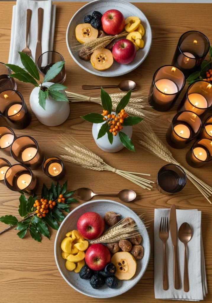 This rustic-polished oak table gets set with shallow bowls of heirloom apples, quince slices, dried figs, and small wheat-sheaf bundles acting as the centerpiece. Low matte-ceramic vases hold tiny sprays of bay and mahonia berries, while hammered-bronze flatware and soft oatmeal linens keep things refined.