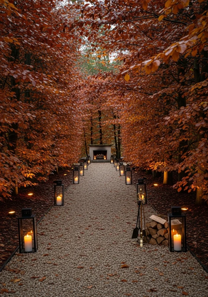 A narrow gravel path winds under copper beech canopies, lined with low black-metal lanterns holding tall ivory tapers at regular intervals. Subtle ground-level amber uplights catch the leaf color from below, while a small hearth area with stacked wood and brass fire tongs waits at the end.