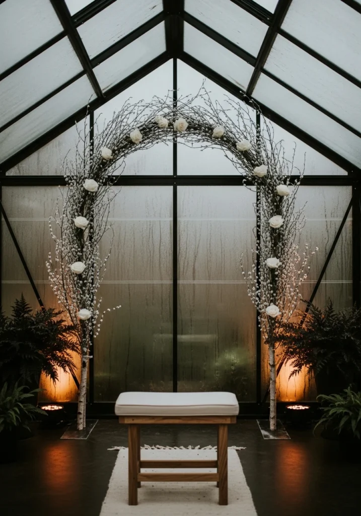 A small glasshouse gets lightly fogged on the glass panes for privacy and atmosphere. Inside, a single slim arch of frosted silver birch branches and minimal white roses creates the ceremony focal point, with a low wooden stool and narrow wool runner defining the aisle.