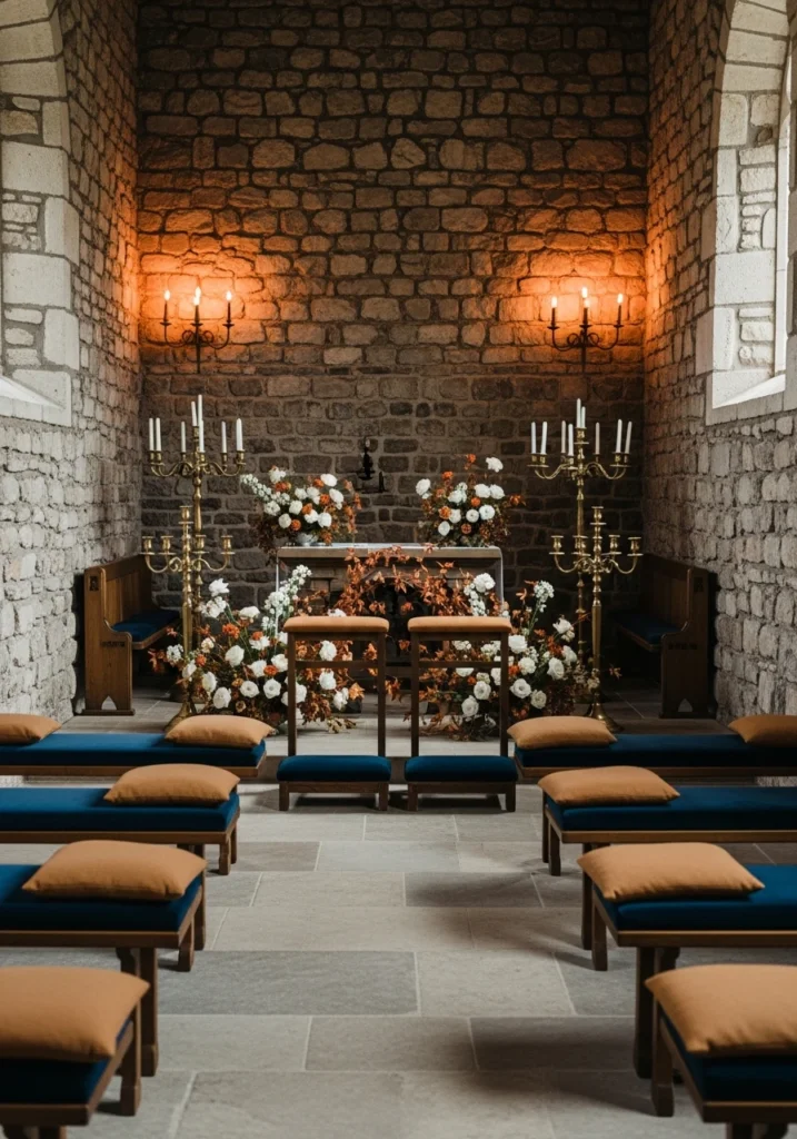 This small stone chapel gets outfitted with low pews and deep-navy velvet kneelers, with side cushions in camel wool for extra comfort. Ornate low brass candelabra flank the altar area, holding clusters of white and rust-toned blooms.
