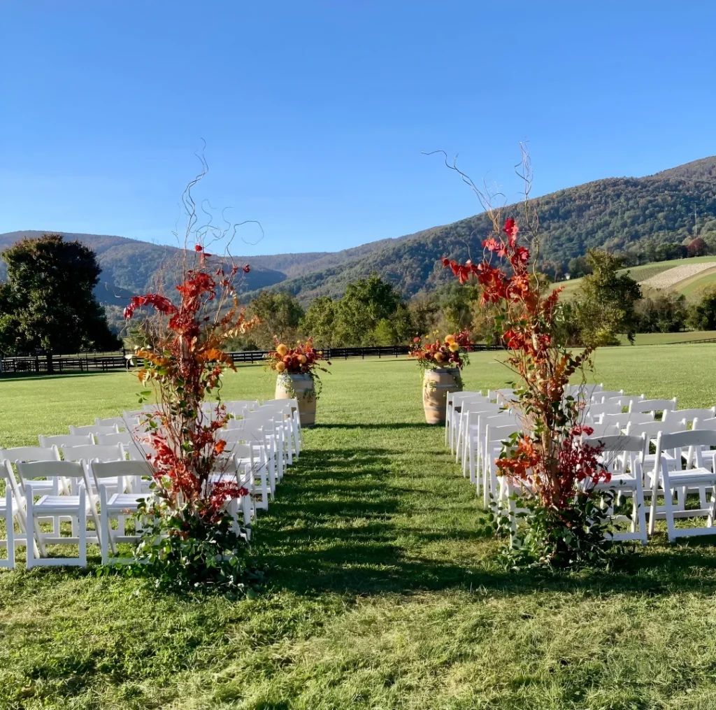 u/carabeanqueen set up this outdoor ceremony with white folding chairs and tall arrangements in rustic containers filled with dramatic fall foliage—deep reds, oranges, and bare twisted branches. The mountain backdrop provides natural drama that needs zero additional decoration.