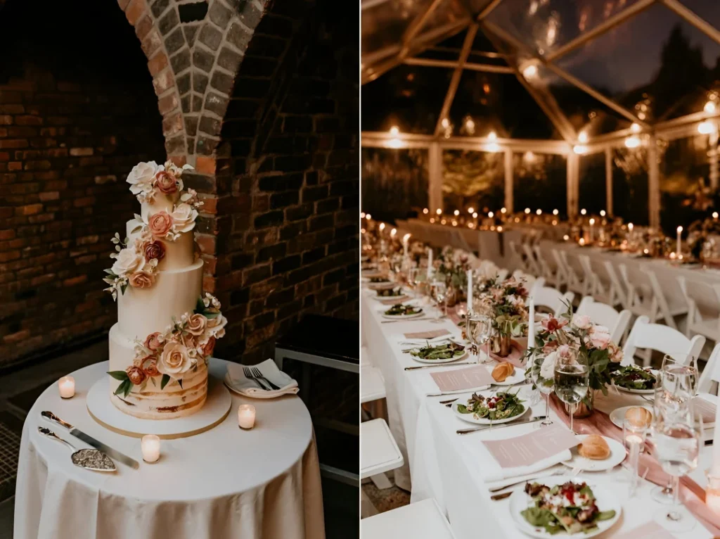The right side shows a long banquet table under a lit pergola structure, with low floral arrangements in blush tones, candles running the length of the table, and that soft romantic lighting making everything look like a fairytale.