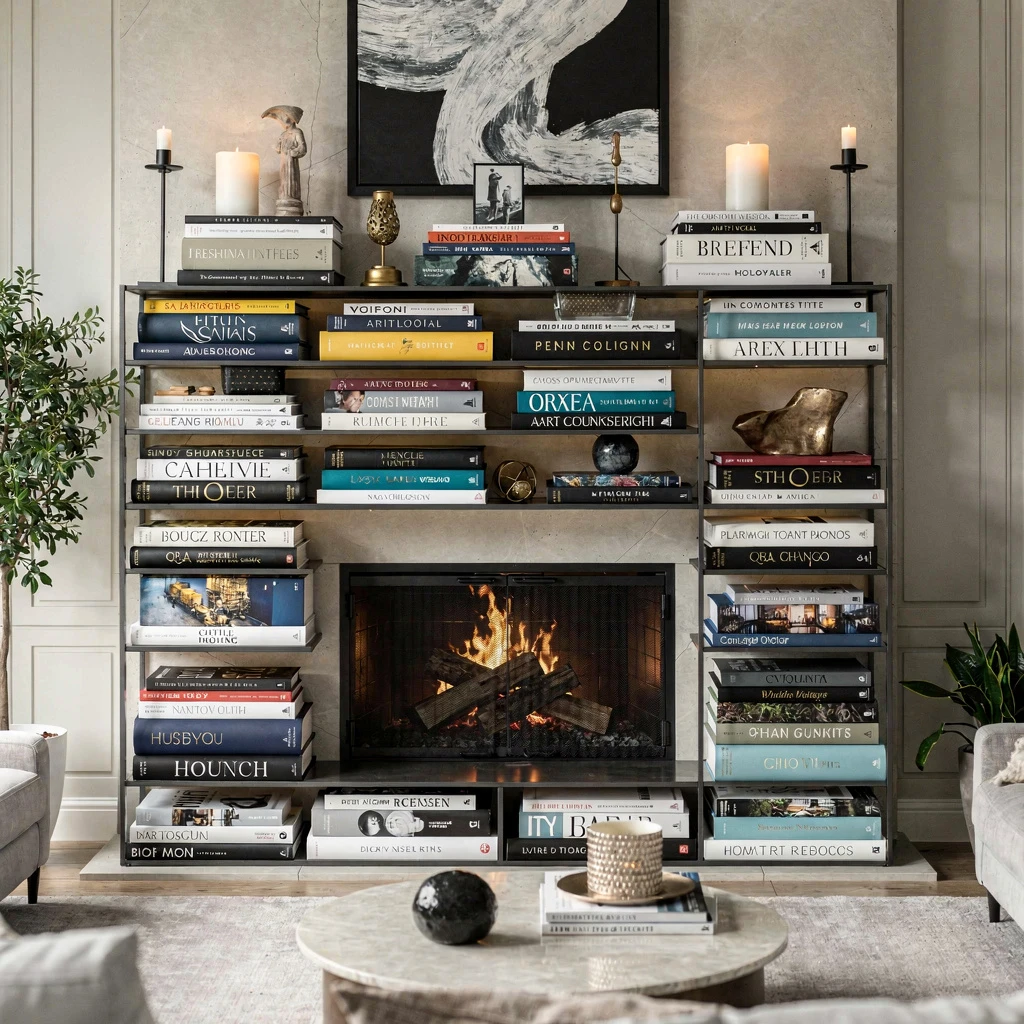 Using books as the primary styling layer—for people whose personality involves reading or at least displaying reading. Large-format design and art books stack horizontally and vertically across the mantel. On top of some stacks sit small decorative objects or candles, but the books remain the visual anchor.