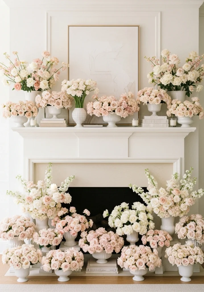 Flowers feel abundant but controlled, never wild or messy because apparently discipline applies even to floral arrangements. No candles, no books, no art layers—just committed floral display. The fireplace becomes high-end event installation rather than everyday decor, perfect for people who want their mantel to look like they hired a florist or actually are one.