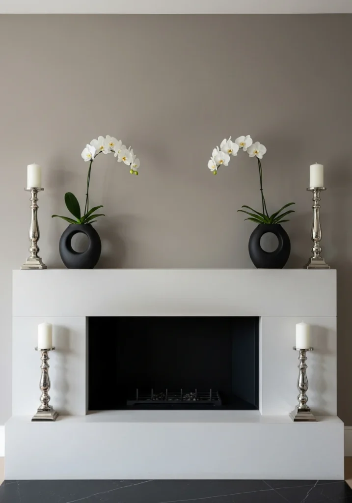 Perfect symmetry for people who find comfort in visual order. Both sides of the mantel mirror each other exactly: same candleholders, same vases, same spacing. The center stays clean or holds single minimal object because apparently balance requires discipline.