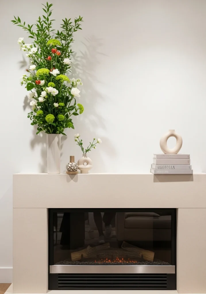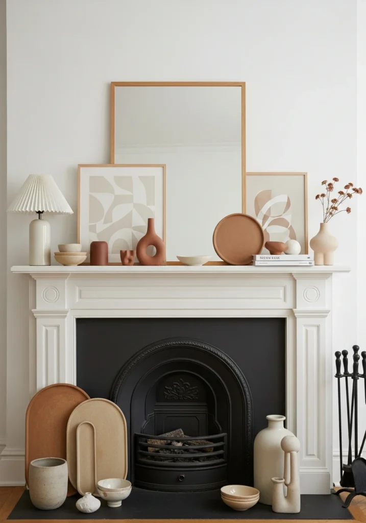 This creates movement and relaxed contemporary editorial feel. The fireplace looks styled rather than arranged—like fashion photoshoot rather than showroom display. Perfect for people who want their mantel to feel considered without looking like they used a ruler.