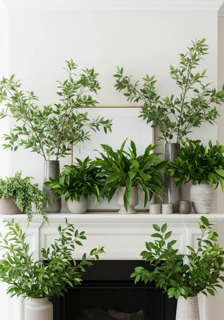 Only greenery. No flowers, no candles, no art layers—just committed plant life. The mantel gets styled with several types of green plants and branches in neutral vessels. Different leaf shapes and heights create visual interest while staying within single color family.