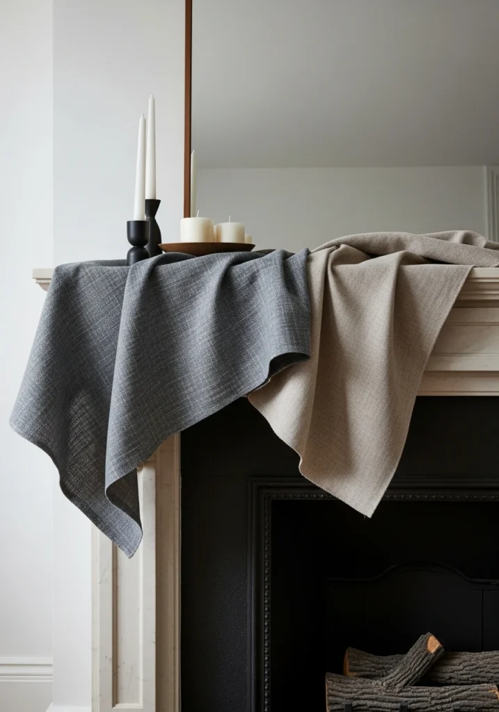 Using textiles instead of hard objects—unconventional and very editorial. Soft fabric runner or draped textile placed across the mantel gets paired with few candles or low objects. The fabric introduces softness, movement, and warmth that hard objects can’t achieve.