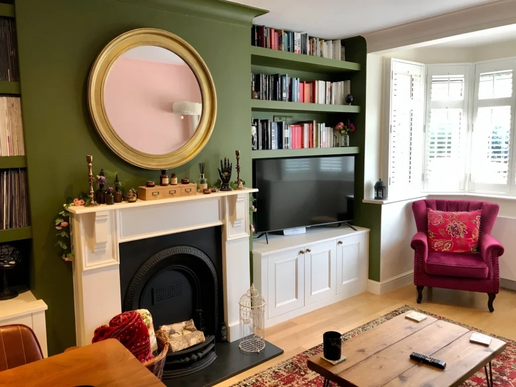 Someone painted their entire wall deep olive green and let that brave decision anchor the entire room instead of chickening out with beige. This traditional white mantel gets styled with curated collection of small decorative objects, candles, and trailing greenery that feels intentional rather than cluttered. The oversized gold circular mirror above reflects light and adds glamorous focal point without competing with the bold wall color.