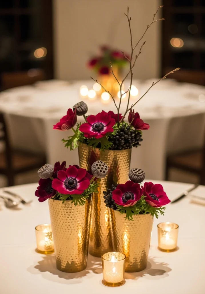 Three asymmetric hammered-brass vessels of varying heights grouped off-center create visual interest through placement and material. Deep-burgundy anemones with their dark centers bring moody richness, and black seed pods add texture.