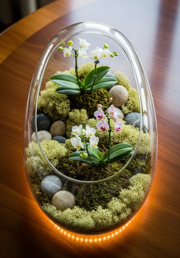 This approach works for modern spaces where you want something living and interesting without traditional bouquet energy. The terrarium contains everything neatly—no water spills, no fallen petals.