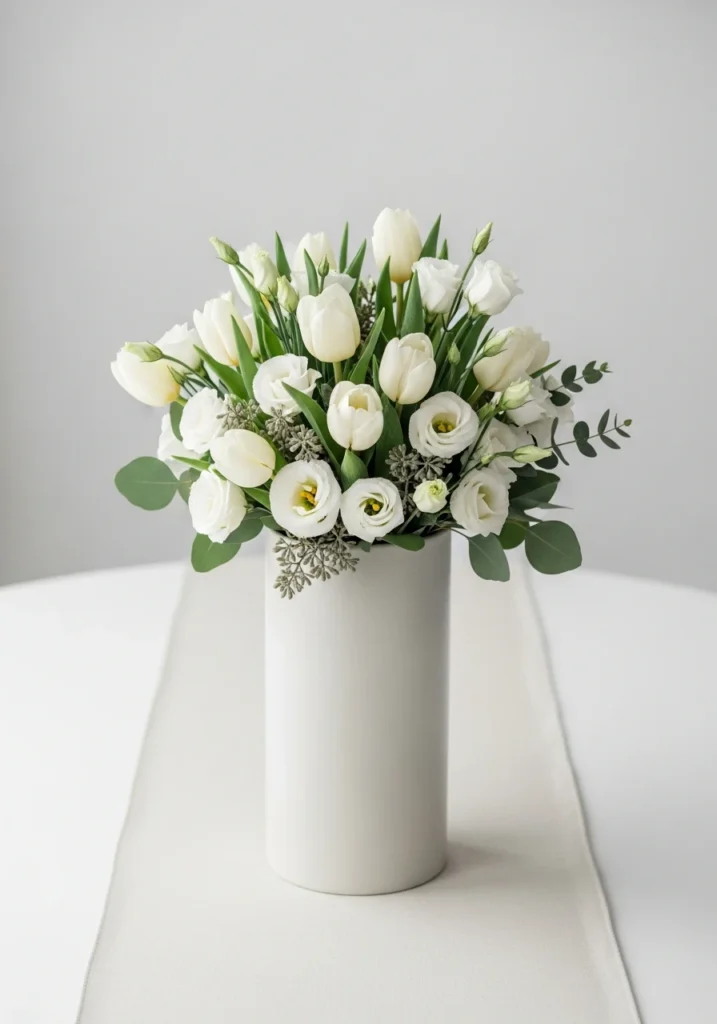 Tall matte-ivory porcelain cylinders filled with tightly arranged ivory tulips, lisianthus, and seeded eucalyptus create serene elegance. Keeping everything in the same tonal family—ivory and cream—feels sophisticated and calm.