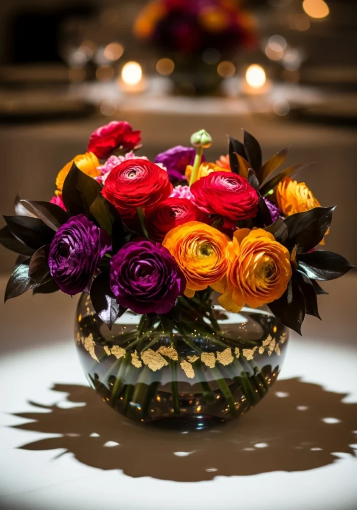 Low smoked-glass orb vases with saturated jewel-toned ranunculus in plum, ruby, and amber create rich color moments. Glossy dark pittosporum leaves add depth without traditional green filler.