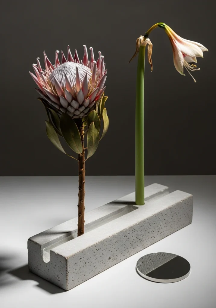 Single oversized dried protea or sculptural amaryllis stems placed in narrow hand-carved limestone plinths with shallow water channels create modern sculpture vibes. It’s floral arrangement as art installation.
