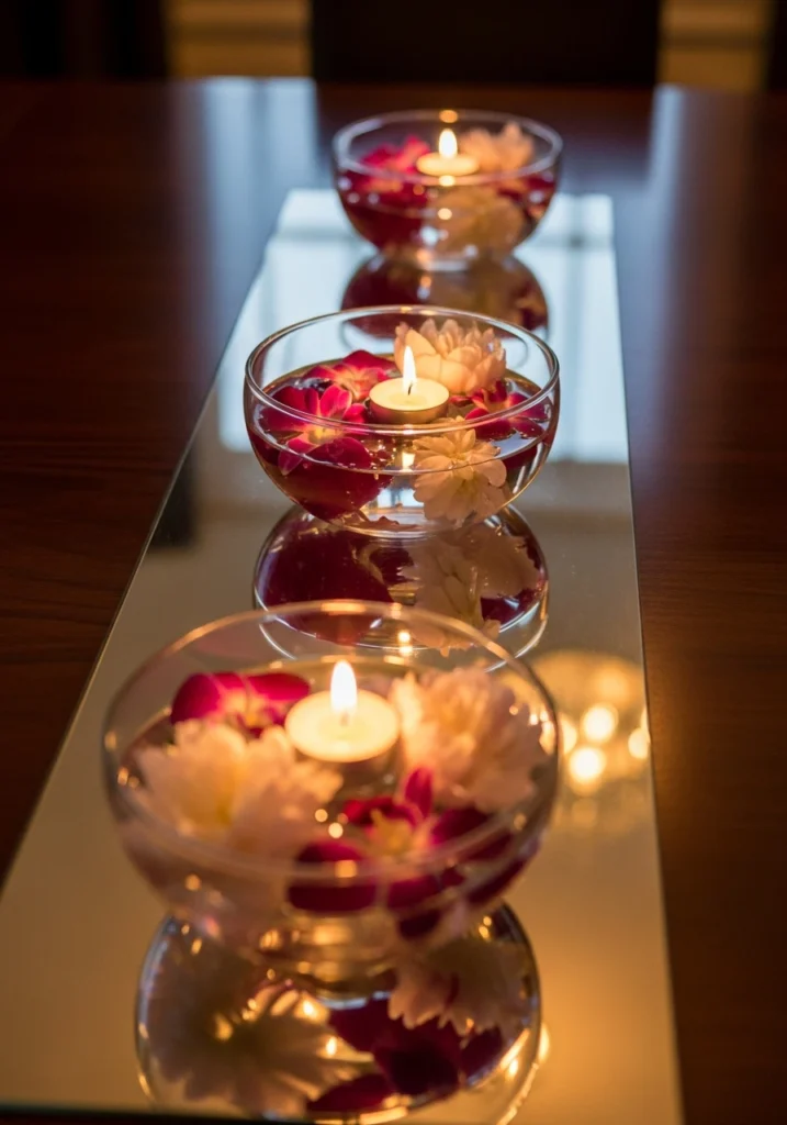 Three low shallow glass bowls with floating orchid and peony petals plus single floating tea lights create romantic ambiance. Arranging them on a mirrored runner multiplies the candlelight effect beautifully.