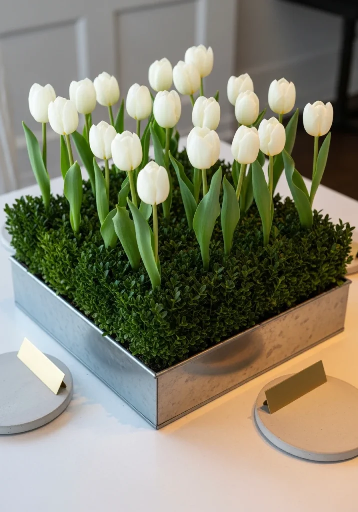 Low rectangular zinc planters with crisply clipped mini-boxwood cubes arranged in a grid create structured green. White long-stem tulips rising in alternating rows add architectural rhythm and height.