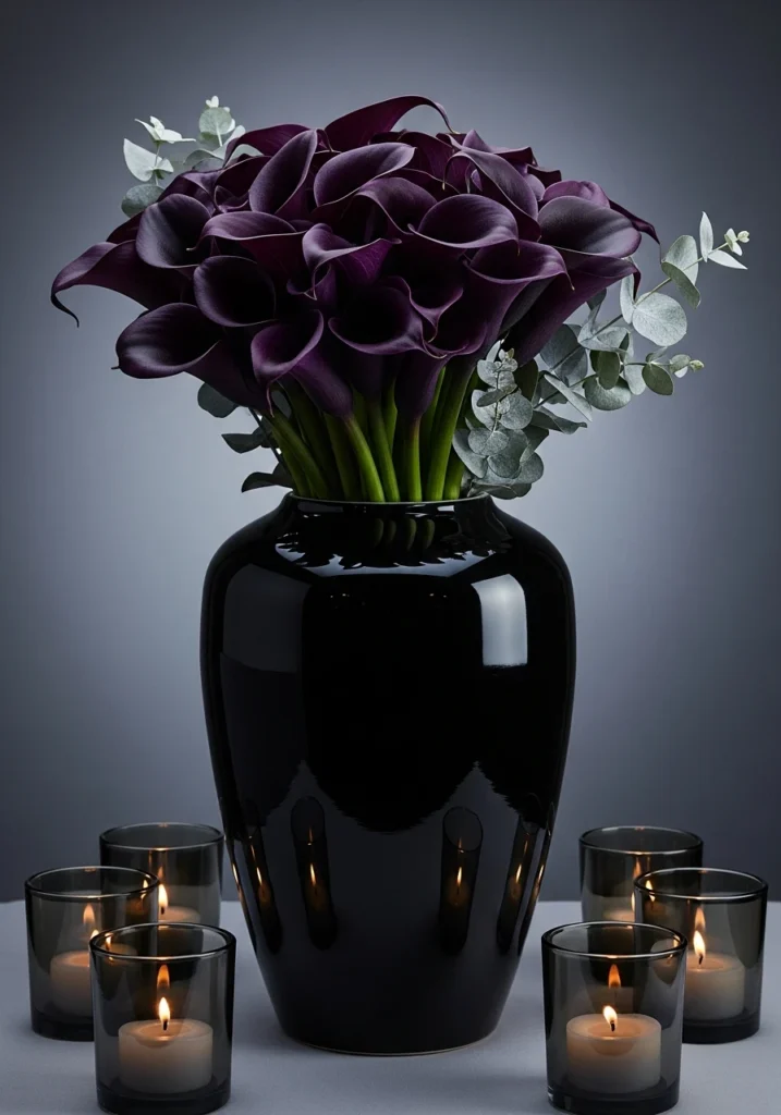 Glossy black porcelain vases with tight clusters of deep-purple (nearly black) calla lilies create moody drama. Silver eucalyptus sprigs add texture and a bit of light against all that darkness.