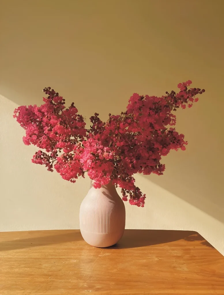 Sometimes one type of flower is all you need. These hot pink bougainvillea branches in a pale pink ribbed vase create impact through sheer volume and color repetition rather than variety.
