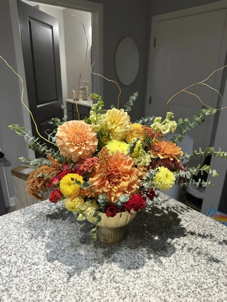 This fall arrangement brings together peach and yellow dahlias, deep red roses, and those sculptural curly willow branches that add height and drama. The brass urn-style vase gives it that traditional harvest table feeling.