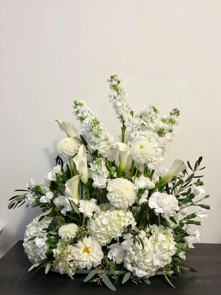 This traditional white arrangement shows how classic funeral florals can still look elegant. Those tall white stock flowers create vertical interest, while calla lilies, dahlias, and carnations fill out the base with varied textures and bloom shapes.