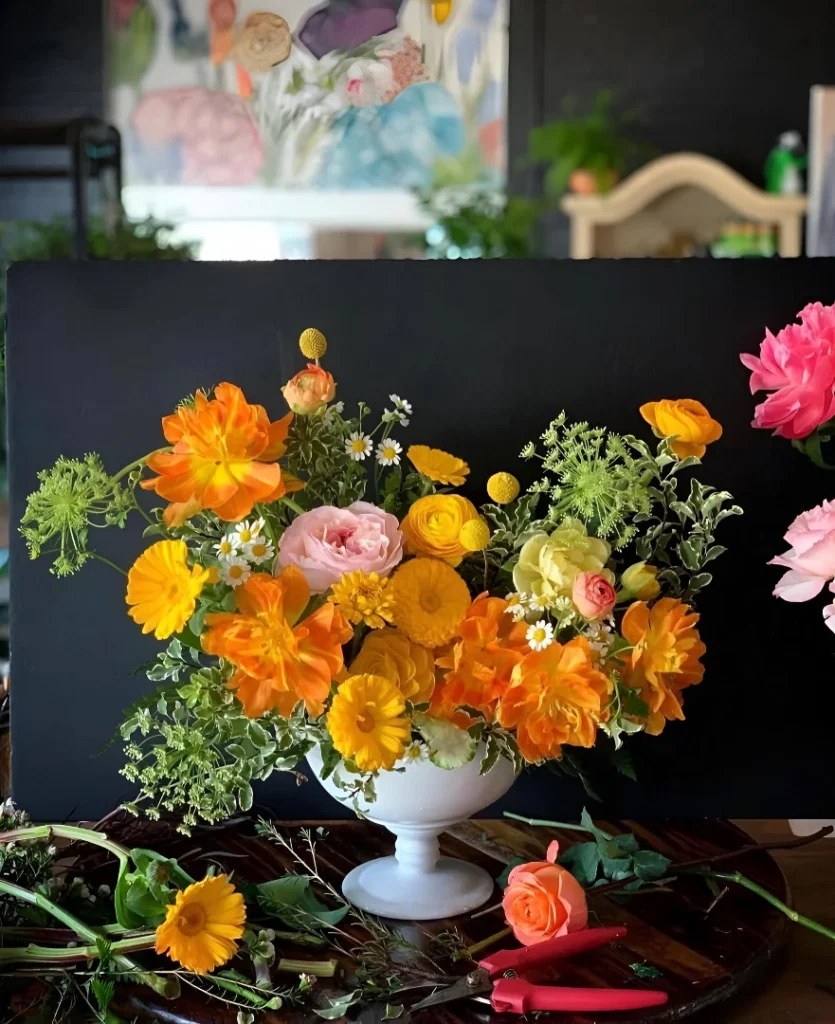 This explosion of warm colors—orange poppies, yellow ranunculus, pink roses—creates serious energy. The white pedestal compote vase elevates the arrangement and gives it that formal garden party feeling.