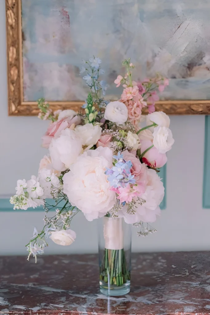 Peonies always read as special occasion flowers, and mixing them with more delicate blooms like the blue and pink stock creates layers of texture and color that feel romantic without being too sweet.