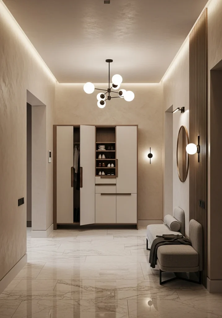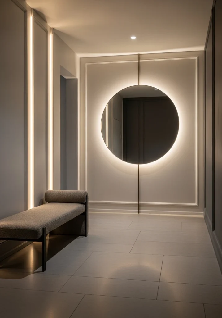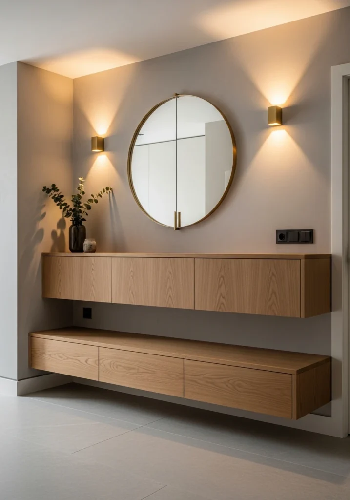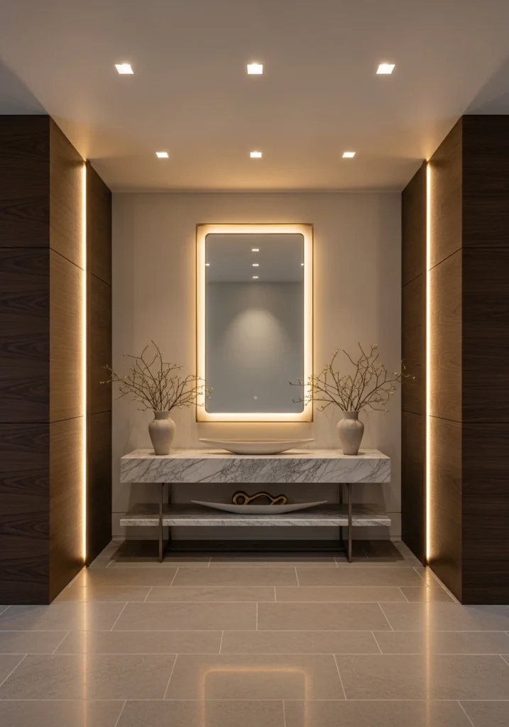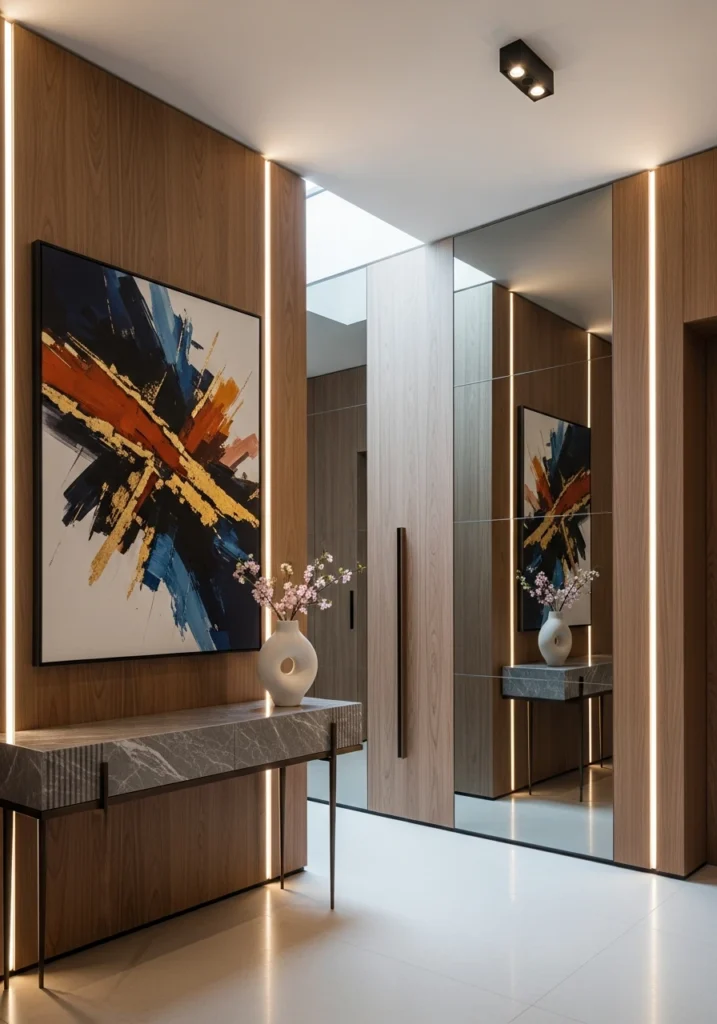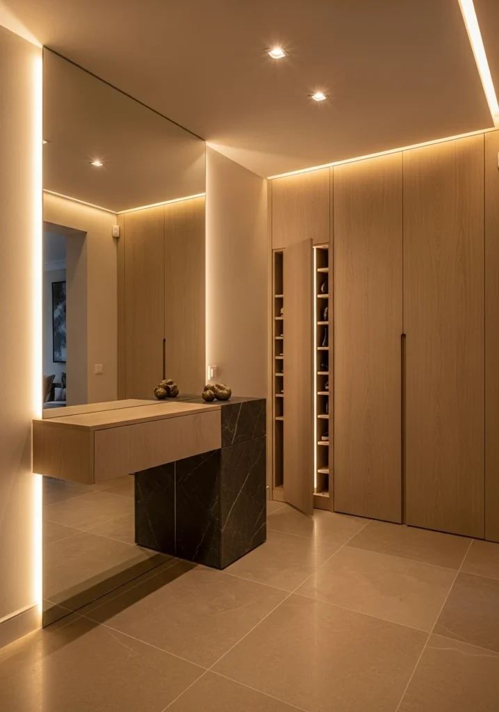 Modern designer entryways feature full-height mirror walls with soft backlighting that doubles perceived space dramatically. Floating wood and stone consoles provide practical surfaces, while concealed shoe storage within wall panels keeps clutter contained.