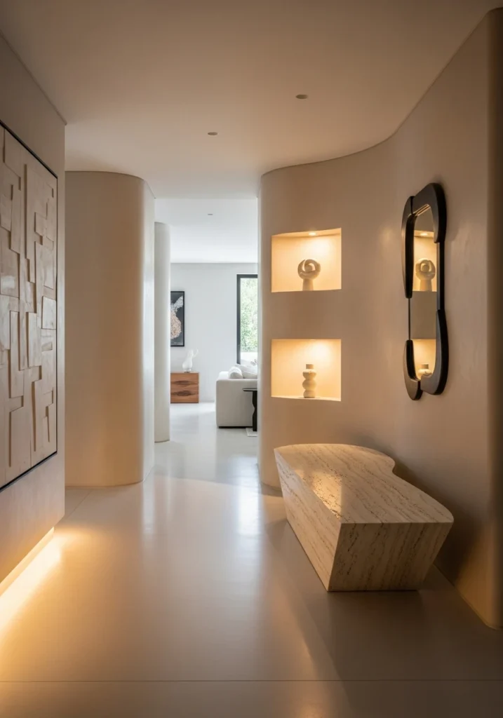 Contemporary entryways built around curved walls and rounded edges feel softer and more welcoming than sharp angles. Monolithic stone benches carved from single pieces create sculptural seating, while integrated wall niches with soft LED illumination display objects beautifully.