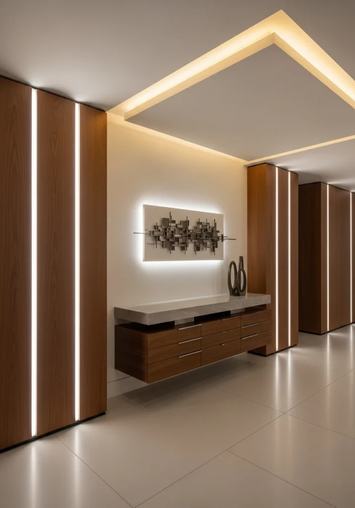 Luxury modern entryways incorporate vertical LED lines embedded directly into wall panels, creating architectural interest through light itself. Custom consoles with stone tops and seamless drawers provide storage without visible hardware, maintaining clean aesthetics.