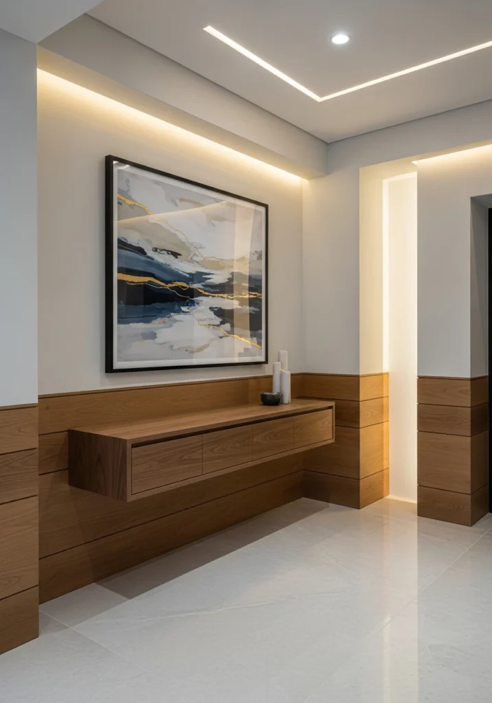 Contemporary foyers combine smooth plaster and wood accents in layered wall treatments that add dimension. Floating entry tables with hidden storage keep surfaces clear, while oversized framed abstract art provides focal points without overwhelming compact spaces.