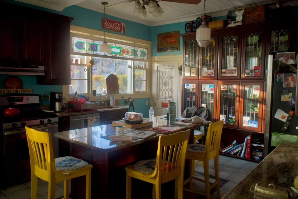 Dark cherry wood cabinetry topped with vintage Coca-Cola signs and antique tins, turquoise walls bright enough to make your eyes water in the best way possible, and a stained glass window transom above the sink that looks like it was salvaged from a 1920s church—this kitchen said “subtlety is for cowards” and committed to the bit. Floor-to-ceiling glass-fronted display cabinets with Gothic-arch mullions showcase a curated collection of vintage dishware, postcards, and memorabilia like a personal museum dedicated to better times. A dark wood island with a granite countertop anchors the center, surrounded by sunny yellow ladder-back chairs with floral cushions that refuse to apologize for their color choice. The vintage milk glass pendant lights, the lived-in clutter on every surface, and the sheer amount of personality crammed into this space prove that grandmacore isn’t about minimalism—it’s about layers, collections, and unapologetic nostalgia. If your kitchen doesn’t make visitors stop and stare at every single detail, you’re not even playing the game. Go bold, go vintage, go home.