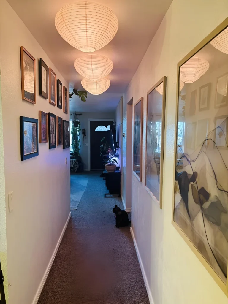 Long narrow hallways make most people nervous, and the nervous response—pale colors, minimal art, nothing that might make it feel tighter—is exactly what turns architectural presence into quiet desperation. This corridor chose the opposite direction. Gallery-dense mixed framing fills the left wall entirely, warm wood and dark frames creating depth that rewards slowing down rather than rushing through. Oversized gold-framed canvases scaled to full wall height on the right make the corridor feel grand rather than pinched. Three Noguchi paper lanterns running the ceiling length provide warm diffused glow that transforms the whole passage into something that feels inhabited rather than merely traversed.