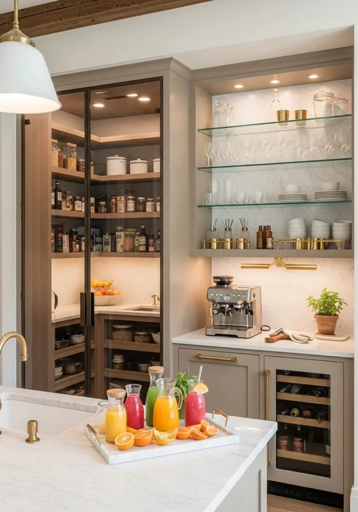 Integrate glass-front walk-in pantries with dedicated butler stations featuring marble counters. Use warm taupe shaker-style cabinetry, shallow farmhouse sinks, and brass barware storage.