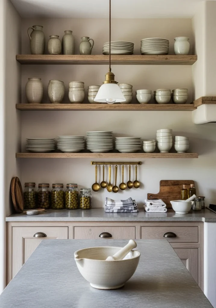Celebrate open shelving as curated galleries using raw timber shelves against soft plaster walls. Vary shelf heights to display hand-thrown pottery, neat plate stacks, and suspended brass measuring spoons.