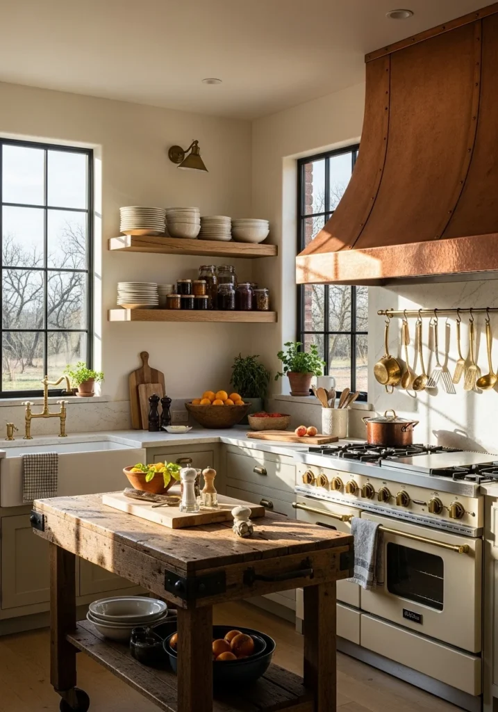 Install hammered copper range hoods over cream enamel ranges for rich metallic warmth. Pair with soapstone countertops, open oak shelving, and blackened steel window framing for material contrast.