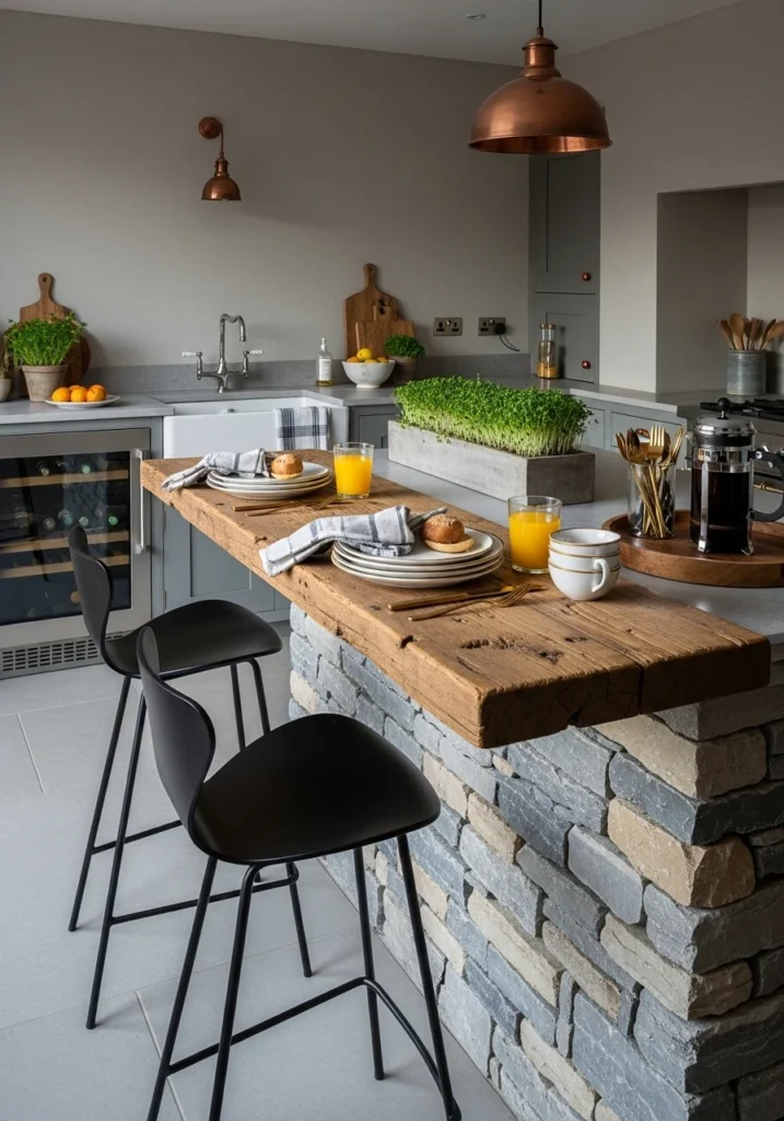 Build reclaimed-timber breakfast bars that cantilever from stone islands, creating casual dining ledges for everyday meals. Use sculptural bar stools in black steel and leather with matte plaster walls and copper pendants overhead.