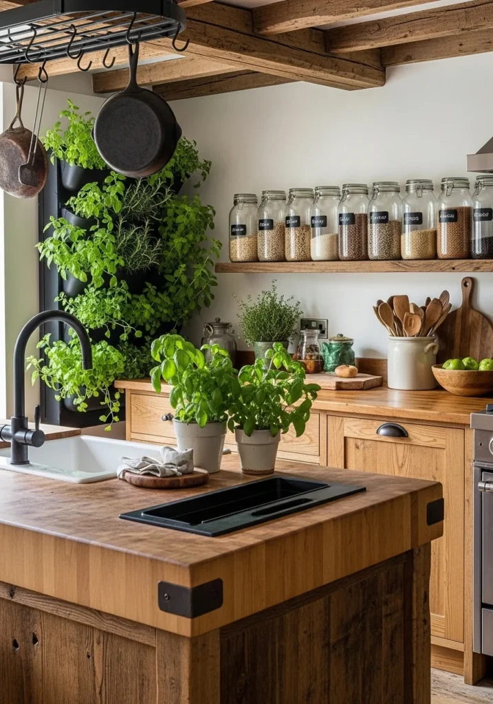 Add glass canisters with labeled grains and hanging cast-iron skillets. Style with fresh herbs, wooden utensils in ceramic crocks, and visible growing elements that connect the kitchen to food production.