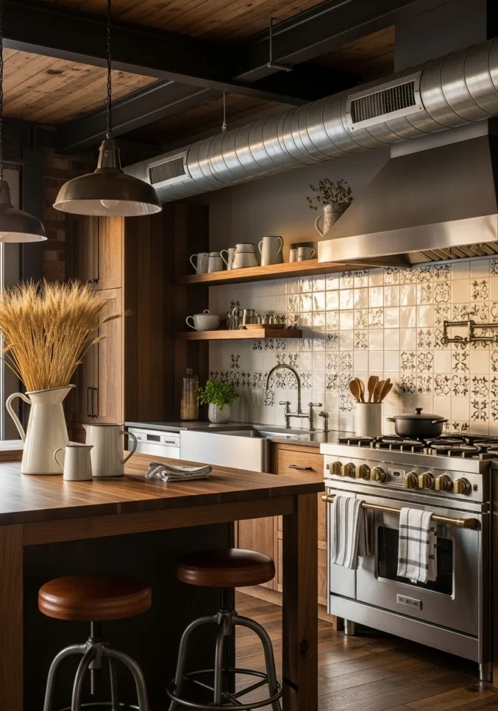 Blend exposed ductwork and steel beams with warm reclaimed wood for sophisticated contrast. Use central islands with thick walnut tops, vintage industrial leather stools, and patterned ceramic tile backsplashes.