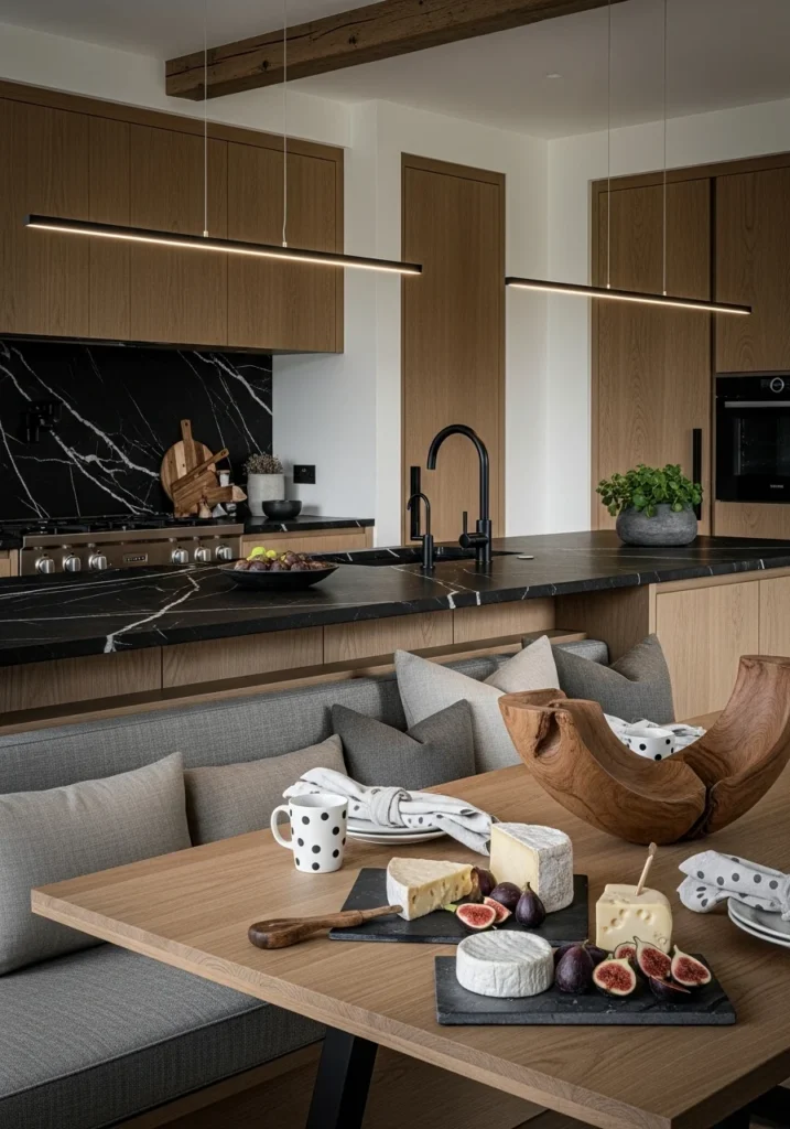 Include built-in banquettes with neutral cushions and sculptural wooden centerpieces. Stage with artisan cheeses on slate boards, fresh figs, and folded linen napkins to show how dramatic materials can still feel welcoming.