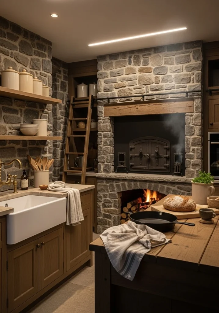 Build a stone hearth housing a wood-fired oven with iron doors as your kitchen’s heart. Use reclaimed stone walls, deep farmhouse sinks with aged brass fittings, and low islands with thick plank tops that feel substantial and permanent.