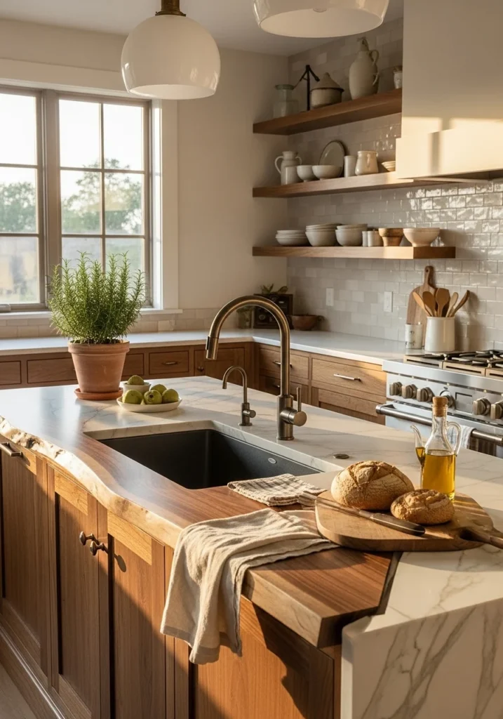 Include a backsplash of hand-cut cream subway tile with floating wooden shelves displaying curated ceramics. Stage with artisan bread on wood boards, olive oil cruets, and linen runners to show how the space works for real cooking and entertaining.