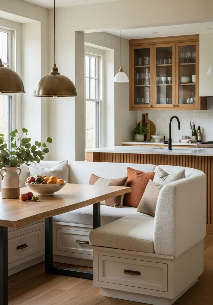 Include curved built-in banquettes upholstered in boucle paired with live-edge oak dining tables. Hang antique brass pendants low over the table with linen cushions and hidden storage drawers beneath the seating.