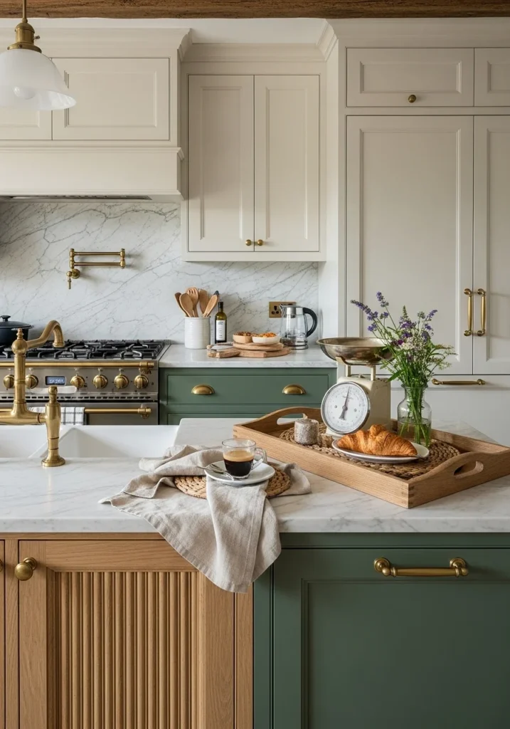 Use two-tone distressed cabinetry with mossy green lower cabinets and cream uppers for sophisticated color layering. Feature book-matched marble backsplashes behind brass ranges, white apron sinks, and fluted oak island panels.