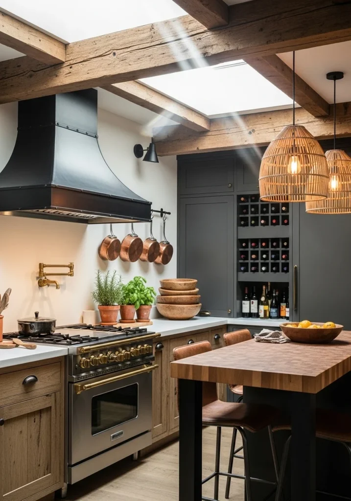 Include woven pendant lights and leather counter stools while building in wine storage niches. Display copper pans, fresh herbs in terracotta pots, and stacked wooden bowls to show the kitchen’s connection to traditional cooking methods.