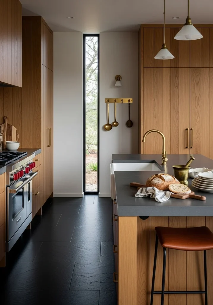 Use large black slate flooring to contrast with warm vertical oak cabinetry. Create oversized islands with matte concrete tops and integrated prep sinks, paired with cognac leather stools.